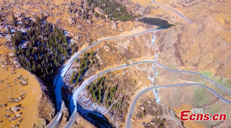 Duku highway, one of China's most dramatic roads, snakes through a snow-covered mountain in northwest China's Xinjiang Uygur Autonomous Region in March. (Photo: China News Service/Hu Renjie)