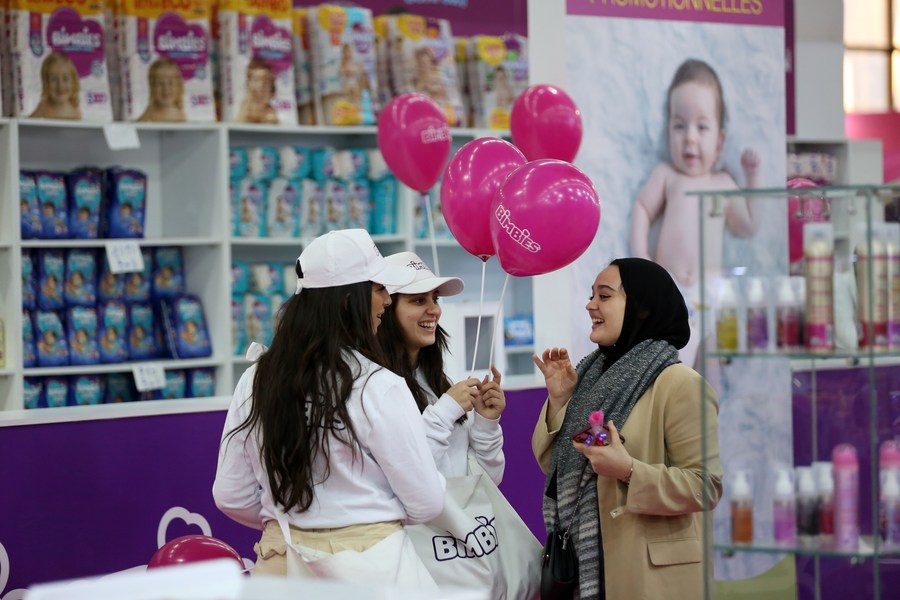 A visitor chats with exhibitors at the 19th international women's fair in Algiers, Algeria, on March 7, 2023. (Xinhua)