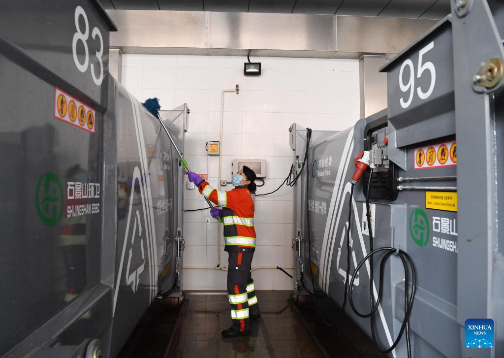 Liu Mingqun disinfects a garbage truck at a garbage station in Shijingshan District of Beijing, capital of China, Feb. 17, 2023. (Xinhua/Zhang Chenlin)