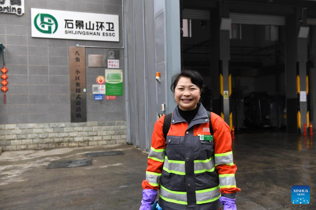 Sanitation worker Liu Mingqun poses for a photo at a garbage station in Shijingshan District of Beijing, capital of China, Feb. 17, 2023. (Xinhua/Zhang Chenlin)