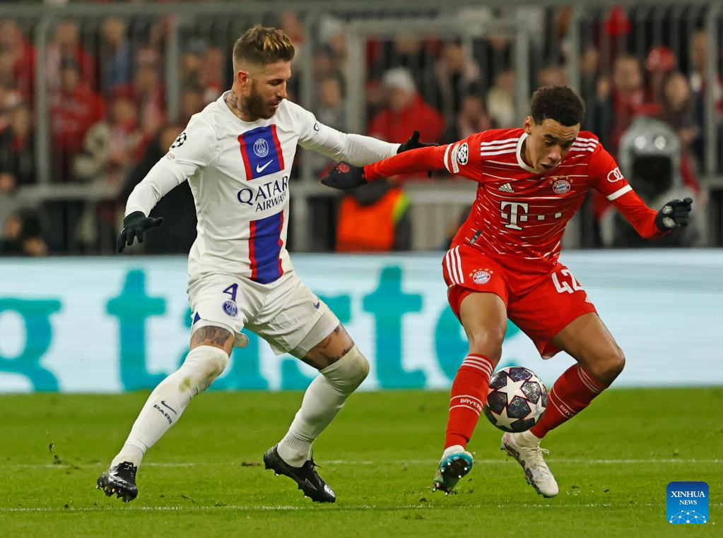 Jamal Musiala (R) of Bayern Munich vies with Sergio Ramos of Paris Saint-Germain during the UEFA Champions League round of 16 second leg football match between Bayern Munich and Paris Saint-Germain in Munich, Germany, on March 8, 2023. (Photo by Philippe Ruiz/Xinhua)