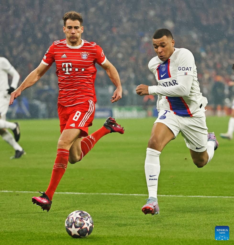 Kylian Mbappe (front) of Paris Saint-Germain competes during the UEFA Champions League round of 16 second leg football match between Bayern Munich and Paris Saint-Germain in Munich, Germany, on March 8, 2023. (Photo by Philippe Ruiz/Xinhua)