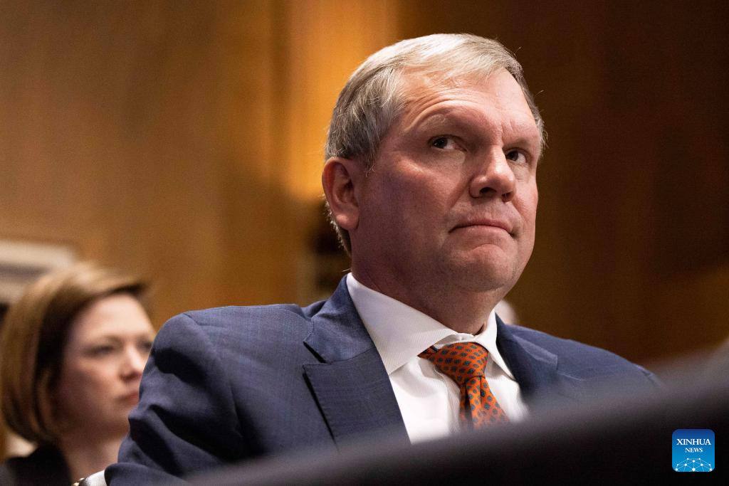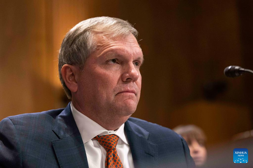 Norfolk Southern CEO Alan Shaw testifies at a hearing before the Senate Environment and Public Works Committee on protecting public health and the environment in the wake of the Norfolk Southern train derailment and chemical release in East Palestine, Ohio in Washington, D.C., the United States, March 9, 2023. The chief executive of U.S. transportation company Norfolk Southern said on Thursday that he's "deeply sorry" for the impact of the train derailment in East Palestine, Ohio, in early February. Local residents, meanwhile, are demanding more action. (Photo by Aaron Schwartz/Xinhua)