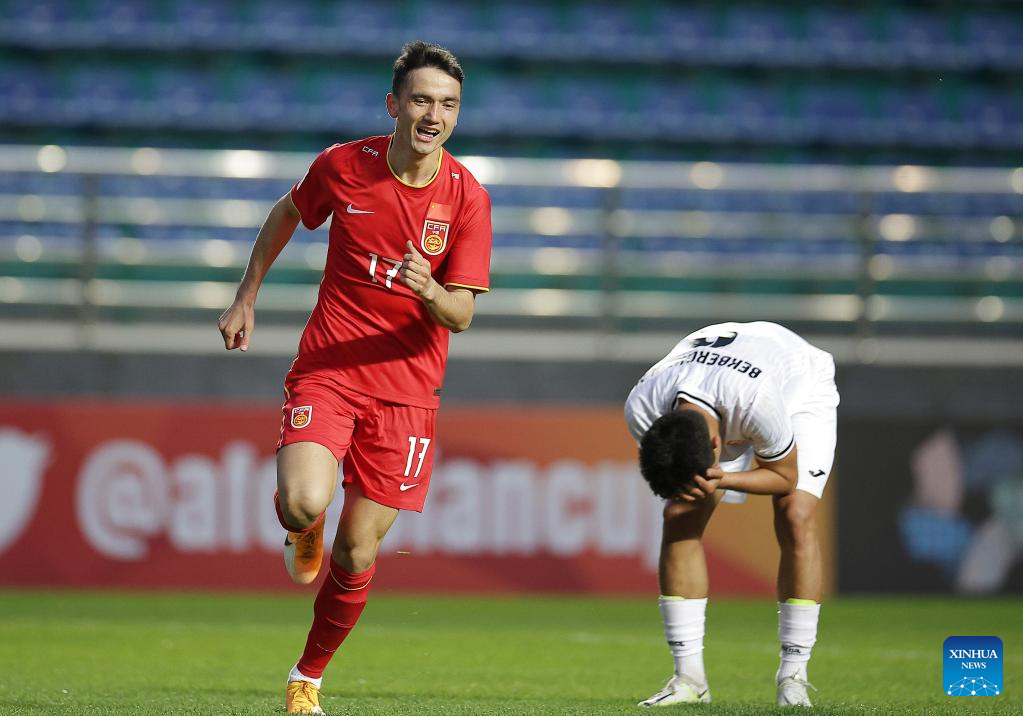 Mutellip Iminqari (L) of China celebrates after Team Kyrgyzstan scores an own goal during the Group D match between China and Kyrgyzstan of AFC U20 Asian Cup in Tashkent, Uzbekistan, March 9, 2023. (Photo by Che Zhouyong/Xinhua)