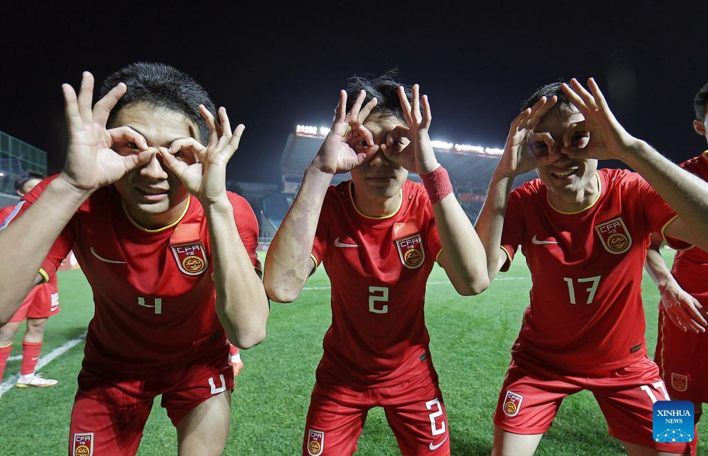 Players of China celebrate after winning the Group D match between China and Kyrgyzstan of AFC U20 Asian Cup in Tashkent, Uzbekistan, March 9, 2023. (Photo by Che Zhouyong/Xinhua)