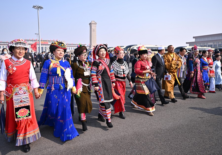 Members of the 14th National Committee of the Chinese People's Political Consultative Conference (CPPCC) walk towards the Great Hall of the People for the opening meeting of the first session of the 14th CPPCC National Committee in Beijing, capital of China, March 4, 2023. (Xinhua/Li Xin)