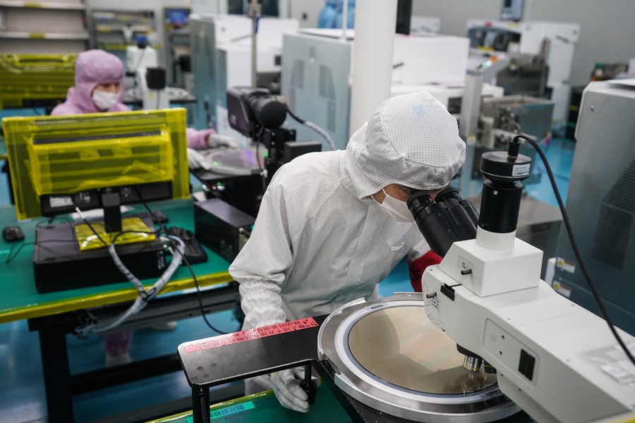 A staff member examines a semiconductor wafer at HT-Tech (Nanjing) Co., Ltd. in Pukou Economic Development Zone of Nanjing, east China's Jiangsu Province, March 9, 2023. (Xinhua/Ji Chunpeng)