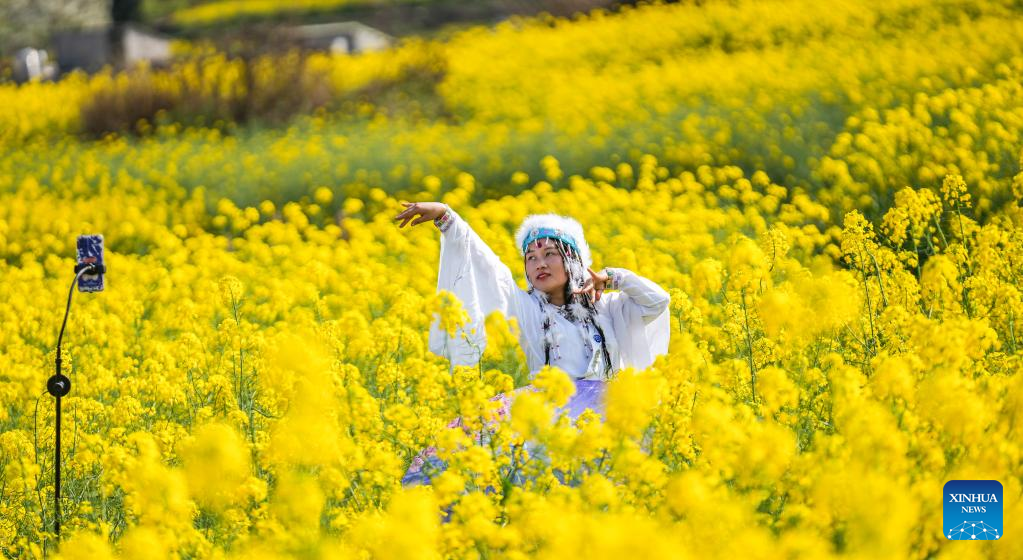 A live streamer dances in a cole flower field in Wayao Village of Mugang Town, Liuzhi Special District, Liupanshui, southwest China's Guizhou Province, March 9, 2023. (Xinhua/Tao Liang)