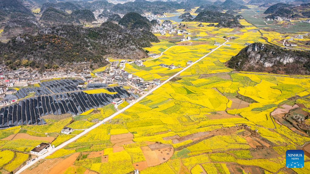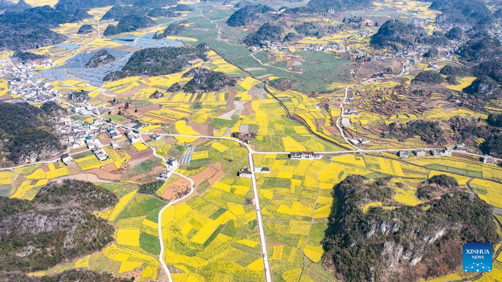 This aerial photo taken on March 9, 2023 shows cole flower fields in Dibo Village of Mugang Town, Liuzhi Special District, Liupanshui, southwest China's Guizhou Province. (Xinhua/Tao Liang)