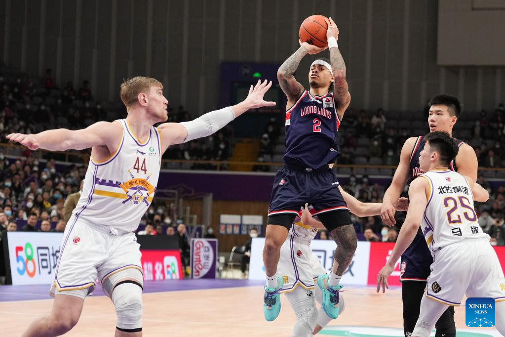 Nathaniel Mason (2nd L) of Guangzhou Loong Lions shoots during the 33rd round match between Beijing Royal Fighters and Guangzhou Loong Lions of 2022-2023 season of the Chinese Basketball Association (CBA) league in Beijing, capital of China, on March 11, 2023. (Xinhua/Ju Huanzong)