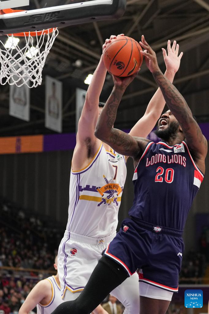 Nathaniel Mason (R) of Guangzhou Loong Lions goes for a lay-up during the 33rd round match between Beijing Royal Fighters and Guangzhou Loong Lions of 2022-2023 season of the Chinese Basketball Association (CBA) league in Beijing, capital of China, on March 11, 2023. (Xinhua/Ju Huanzong)