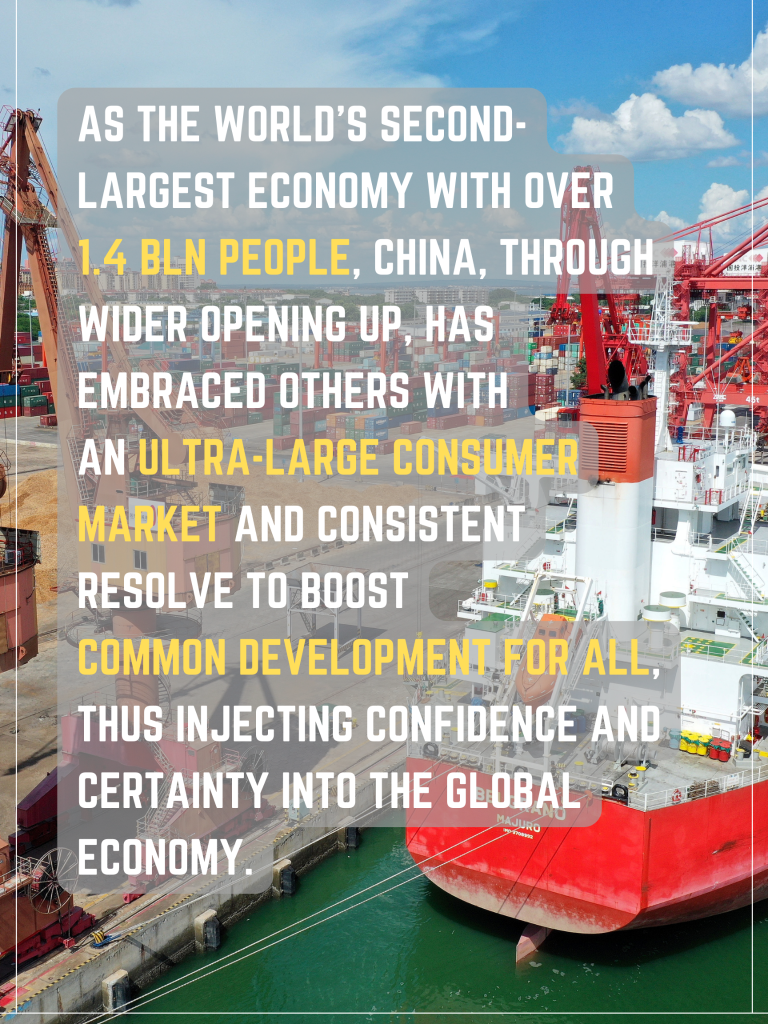 As the world's second-largest economy with over 1.4 billion people, China, through wider opening up, has embraced others with an ultra-large consumer market and consistent resolve to boost common development for all, thus injecting confidence and certainty into the global economy.