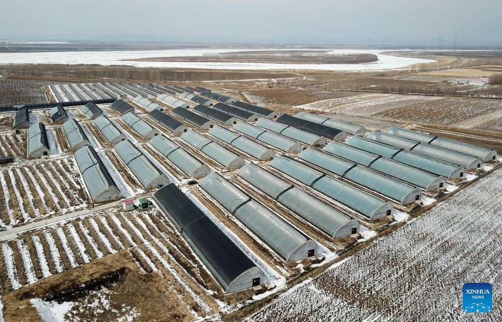 This aerial photo taken on March 9, 2023 shows greenhouses in Jiamusi, northeast China's Heilongjiang Province. In Heilongjiang Province, though the temperature is still low in early spring, villagers are taking advantage of greenhouses to boost agricultural production efficiency and increase their income. (Xinhua/Wang Jianwei)
