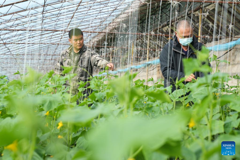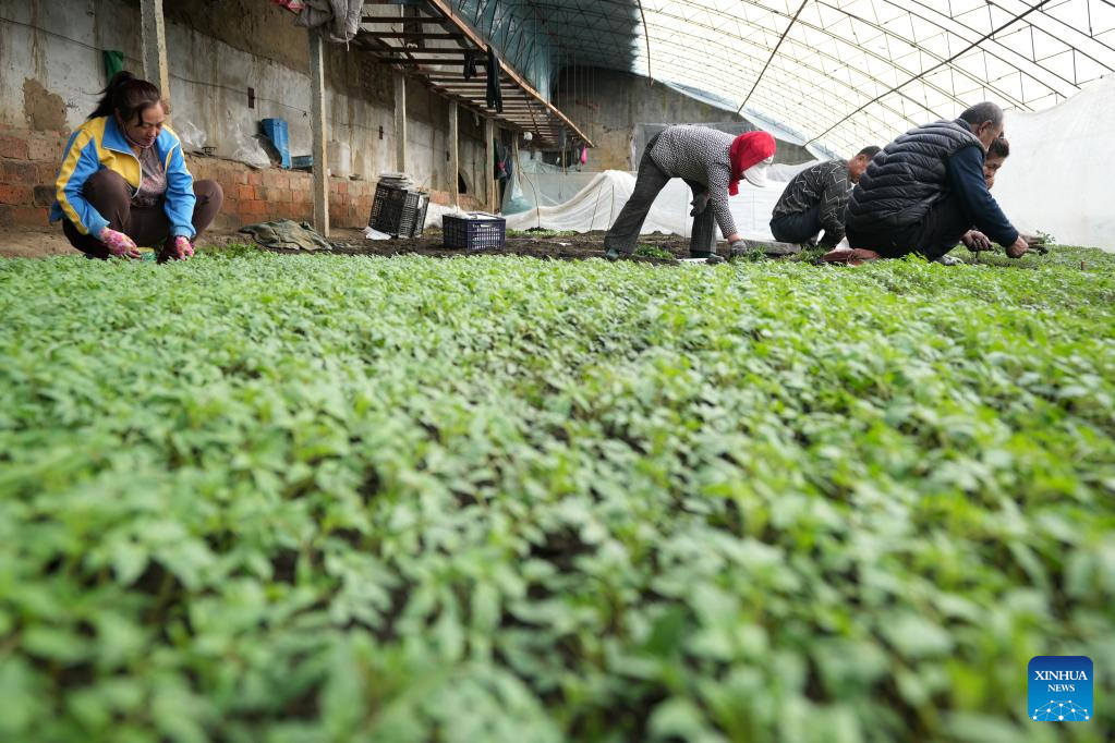 Villagers work at a greenhouse in Xingsheng Village of Ning'an Town, Ning'an City, Mudanjiang, northeast China's Heilongjiang Province, March 10, 2023. In Heilongjiang Province, though the temperature is still low in early spring, villagers are taking advantage of greenhouses to boost agricultural production efficiency and increase their income. (Xinhua/Wang Jianwei)
