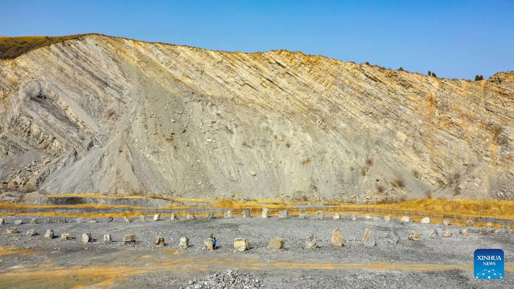 Stones are set on land for tourism at the former site of the wasted Donghouziyu quarry in Jizhou District, north China's Tianjin, March 10, 2023. (Xinhua/Sun Fanyue)