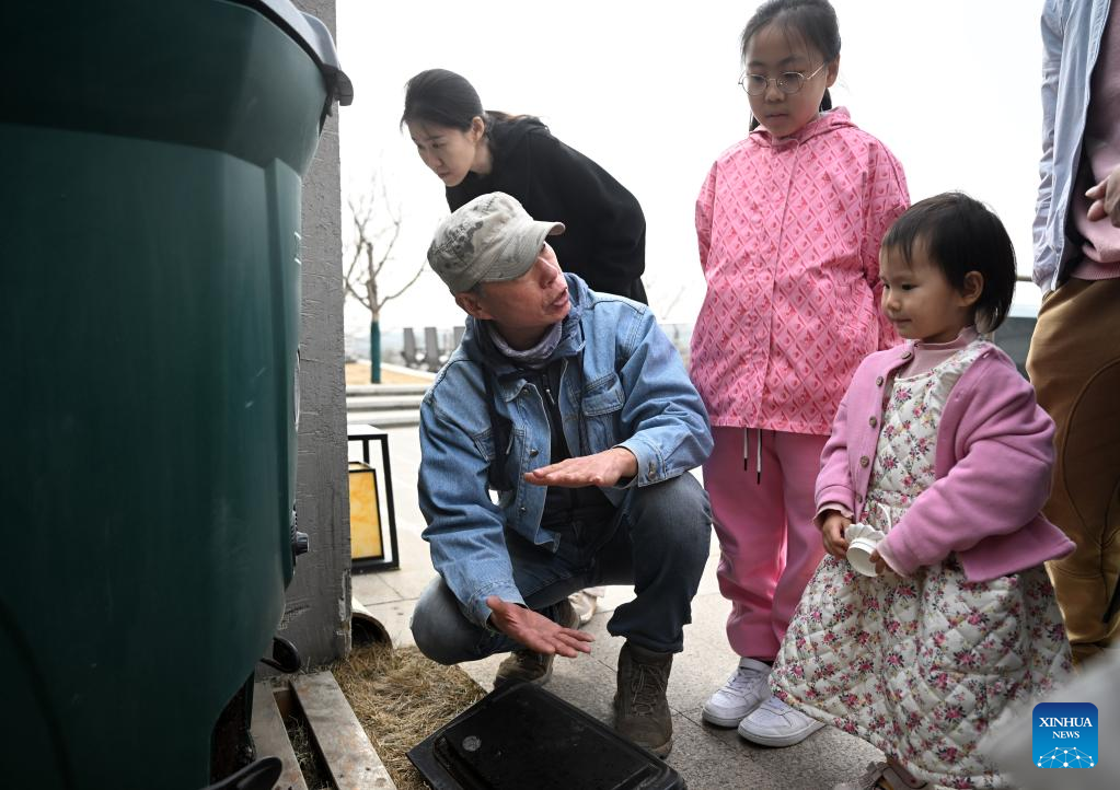 Visitors learn about compost with a teacher at the "eden Chunshanli" life demonstration area in Jizhou District, north China's Tianjin, March 11, 2023. (Xinhua/Zhao Zishuo)