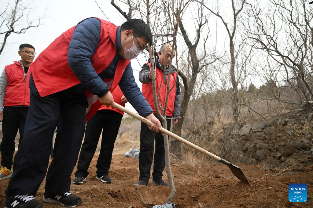 Volunteers plant trees at the "eden Chunshanli" life demonstration area in Jizhou District, north China's Tianjin, March 11, 2023. (Xinhua/Zhao Zishuo)