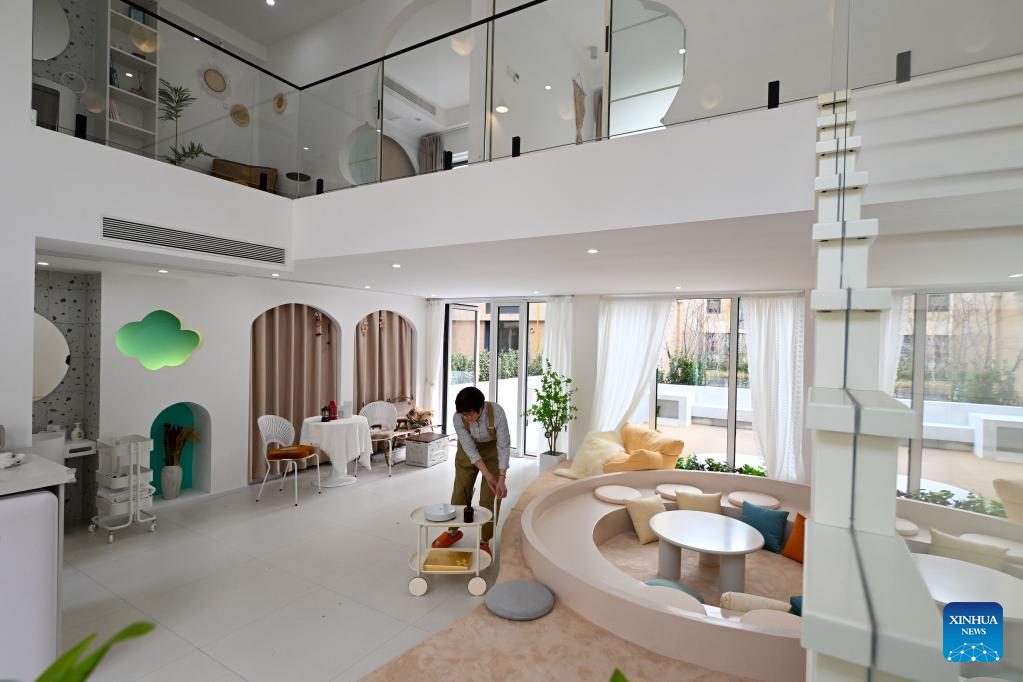 A homestay owner arranges furniture at a homestay of the "eden Chunshanli" life demonstration area in Jizhou District, north China's Tianjin, March 10, 2023. (Xinhua/Sun Fanyue)