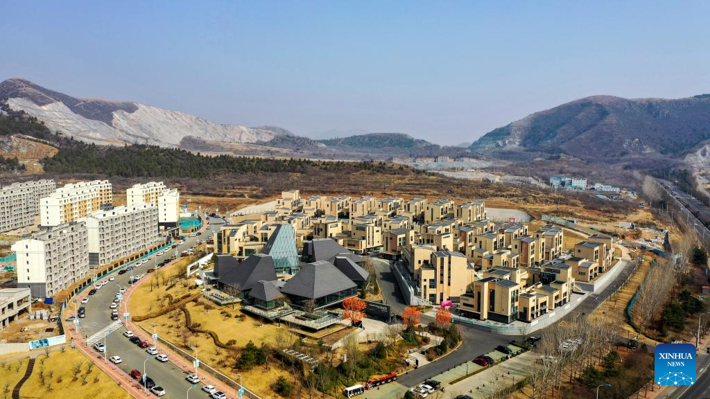This aerial photo taken on March 10, 2023 shows the "eden Chunshanli" life demonstration area at the former site of the wasted Donghouziyu quarry in Jizhou District, north China's Tianjin. (Xinhua/Sun Fanyue)