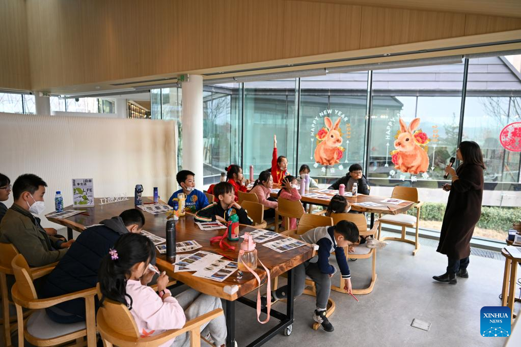 Children learn about green architecture at the "eden Chunshanli" life demonstration area in Jizhou District, north China's Tianjin, March 11, 2023. (Xinhua/Sun Fanyue)