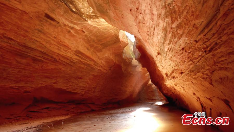 Sunshine casts into the Ganquan canyon through the fissures, creating mysterious beauty at Ganquan County of Yan'an, northwest China's Shaanxi Province. Rain, water and wind over millions of years has sculpted its red sandstone into various textures and shapes. (Photo: China News Service/Bai Teng)