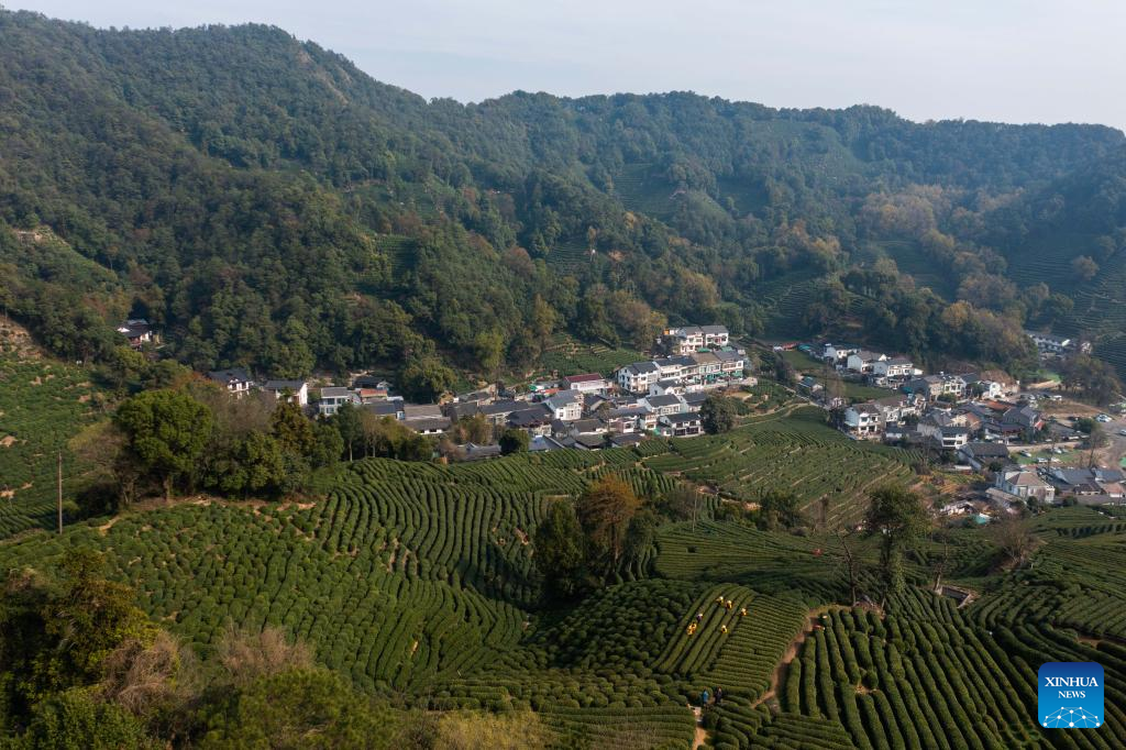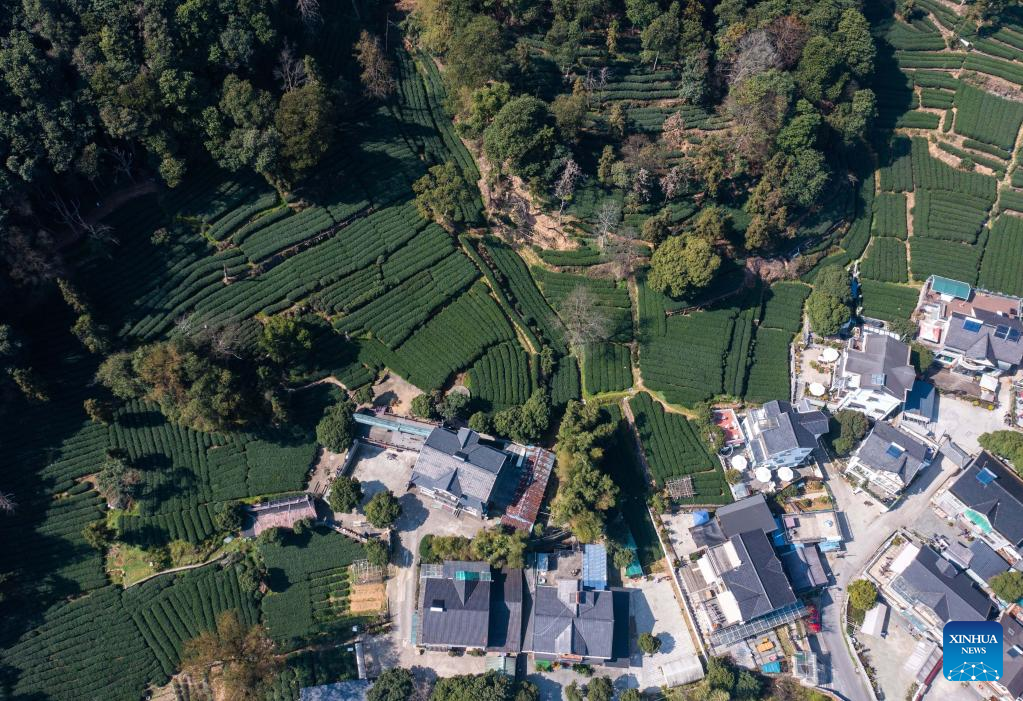 This aerial photo taken on March 13, 2023 shows tea mountains in Longjing Village of Hangzhou, east China's Zhejiang Province. (Xinhua/Xu Yu)