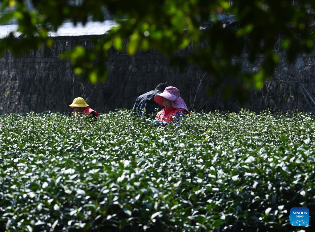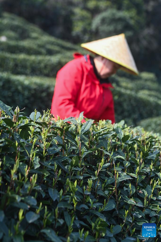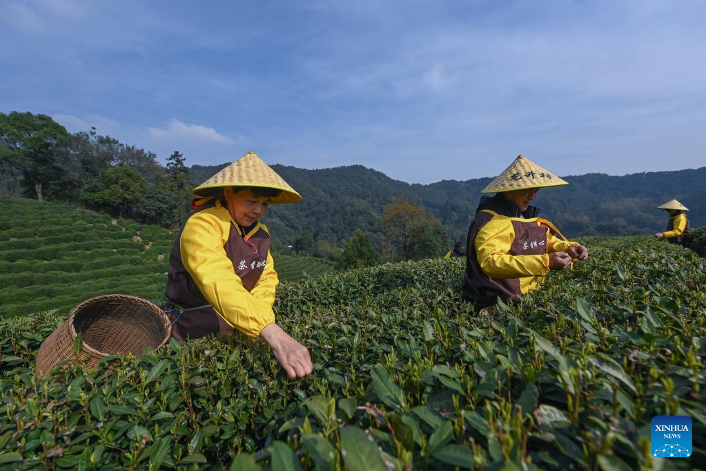 Tea-picking workers harvest Longjing tea leaves at a tea garden in Meijiawu Village of Hangzhou City, east China's Zhejiang Province, March 13, 2023. (Xinhua/Xu Yu)