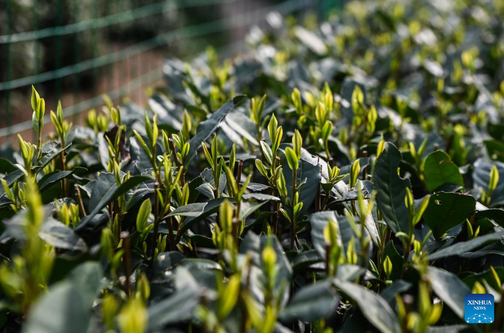 This photo taken on March 13, 2023 shows fresh Longjing tea leaves on a tea mountain in Longjing Village of Hangzhou, east China's Zhejiang Province. (Xinhua/Xu Yu)
