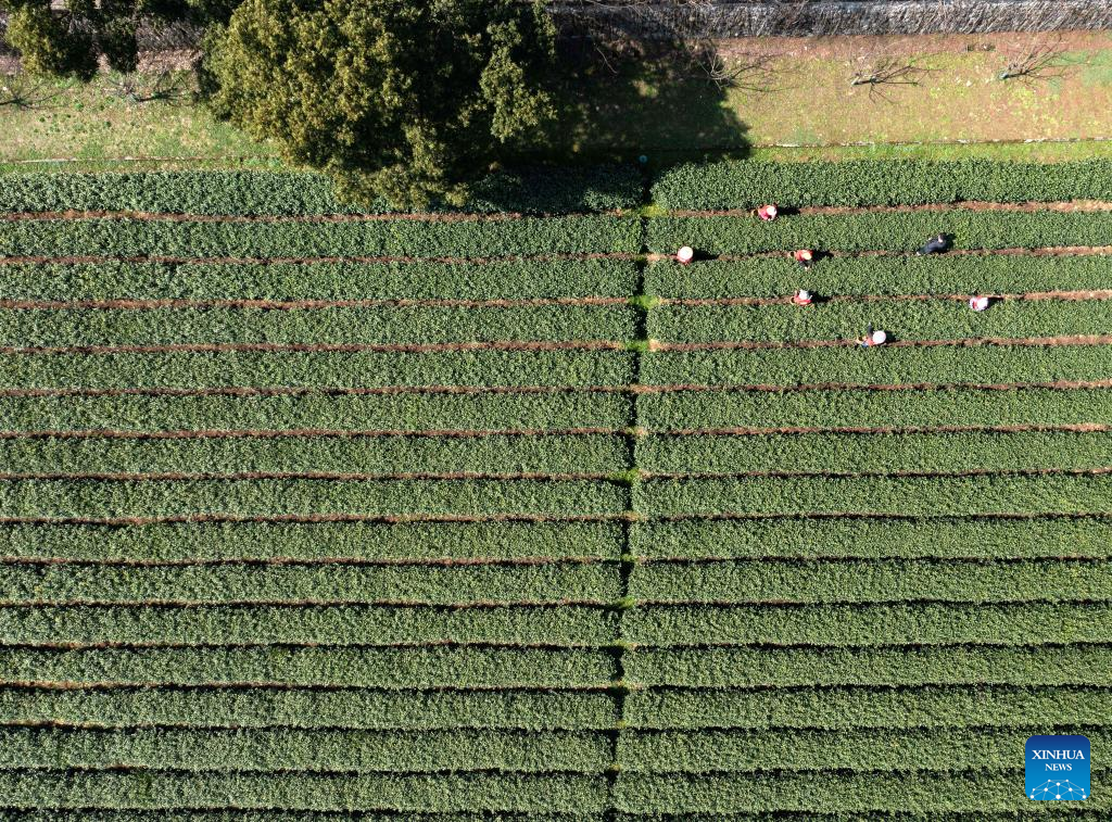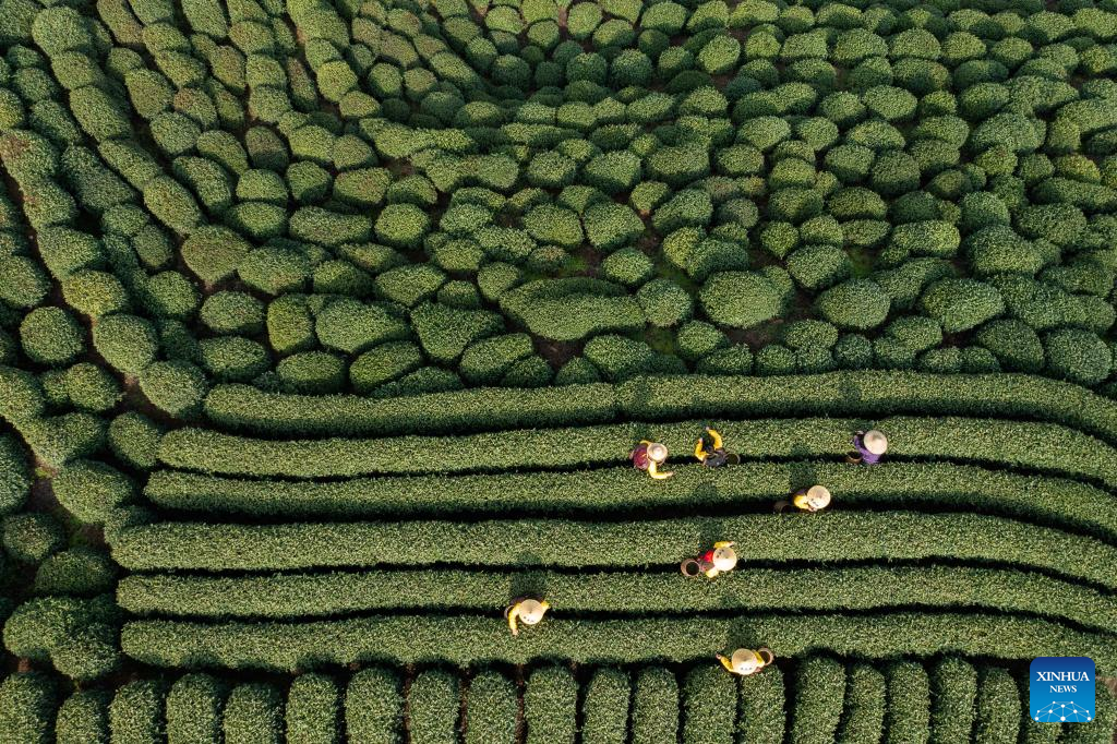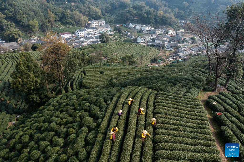 This aerial photo taken on March 13, 2023 shows tea-picking workers harvesting Longjing tea leaves at a tea garden in Longjing Village of Hangzhou, east China's Zhejiang Province. (Xinhua/Xu Yu)