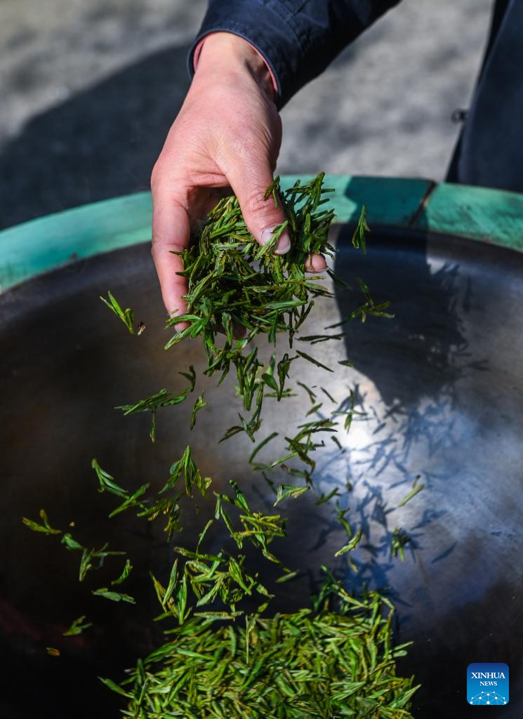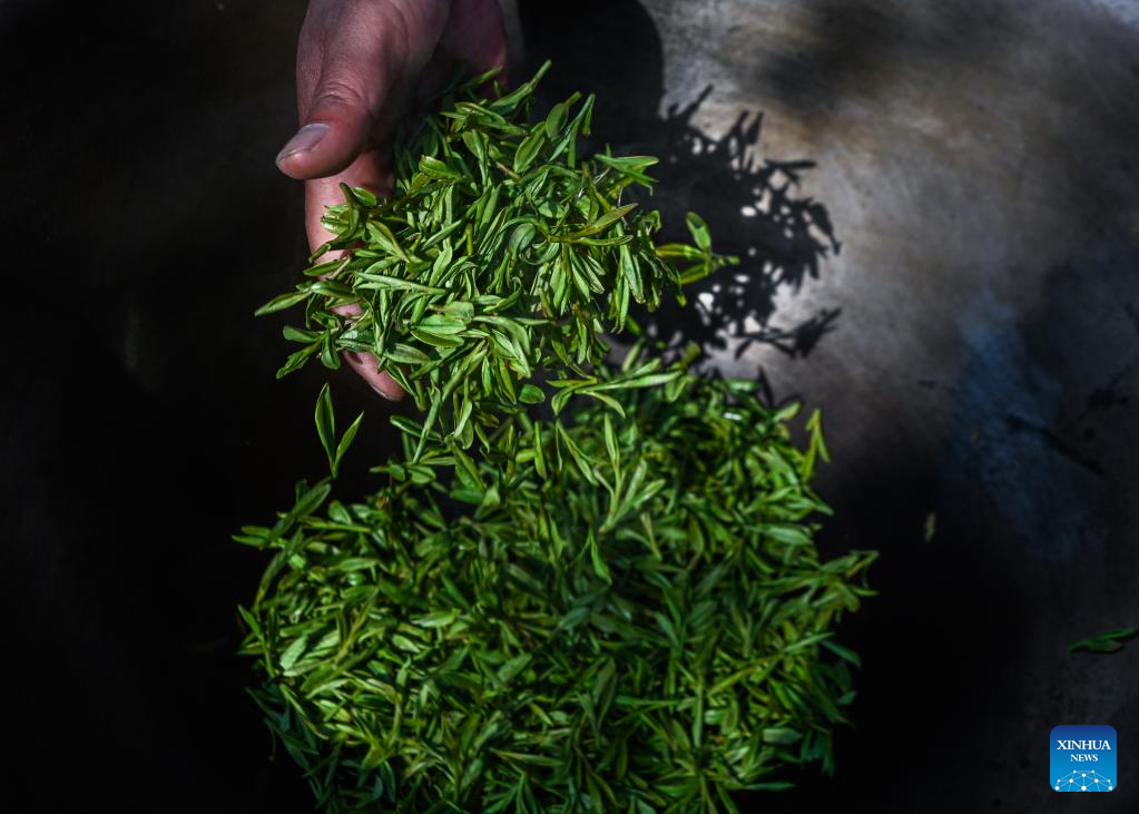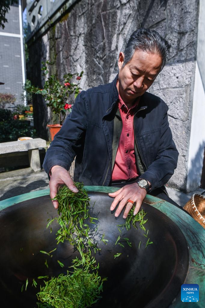 A farmer stirs and roasts fresh Longjing tea leaves in Longjing Village of Hangzhou, east China's Zhejiang Province, March 13, 2023. (Xinhua/Xu Yu)