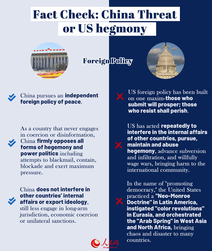 The "China threat" idea has long been bandied about by US politicians trying to steal the spotlight from the media and the people. Will China become an actual threat to the world? Or by hyping up the "China threat", is the US simply finding an excuse to maintain its aggressive and hegemonic behavior? Here are facts that People's Daily Online has collected.