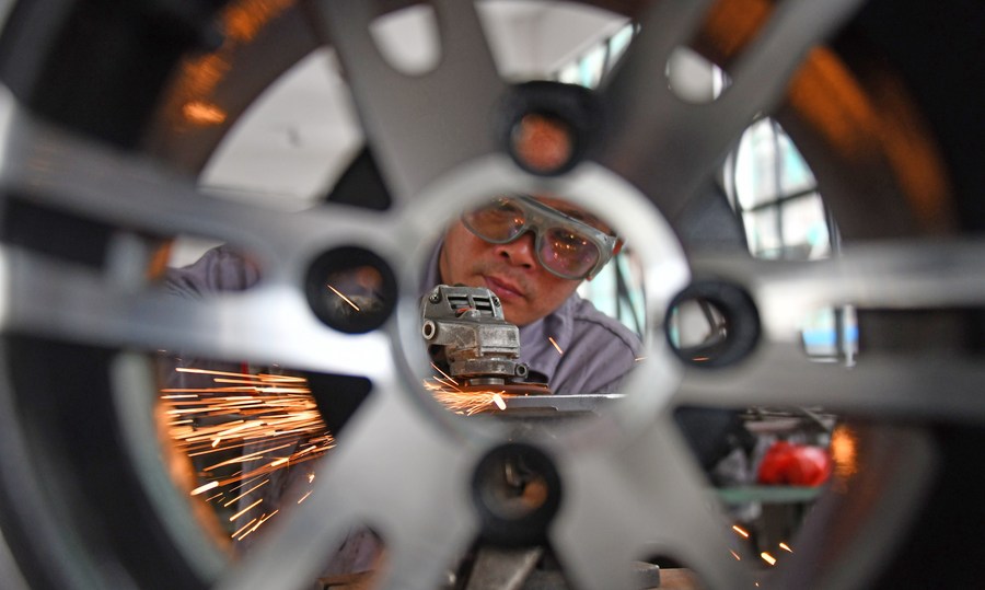 A staff member works on an automotive part at a workshop in a motor vehicle company in Xianju County of Taizhou City, east China's Zhejiang Province, Feb. 13, 2023. (Photo by Wang Huabin/Xinhua)