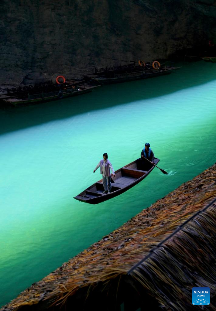 This aerial photo taken on March 14, 2023 shows a boat rides in the Pingshan canyon, a tourist attraction famous for its limpid water, in Hefeng County, Enshi Tujia and Miao Autonomous Prefecture, central China's Hubei Province. (Photo by Yang Shunpi/Xinhua)