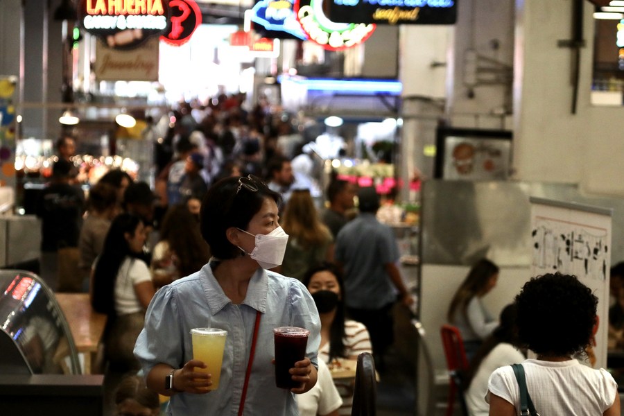 Customers are seen at the Grand Central Market in Los Angeles, California, the United States, July 29, 2022. (Xinhua)
