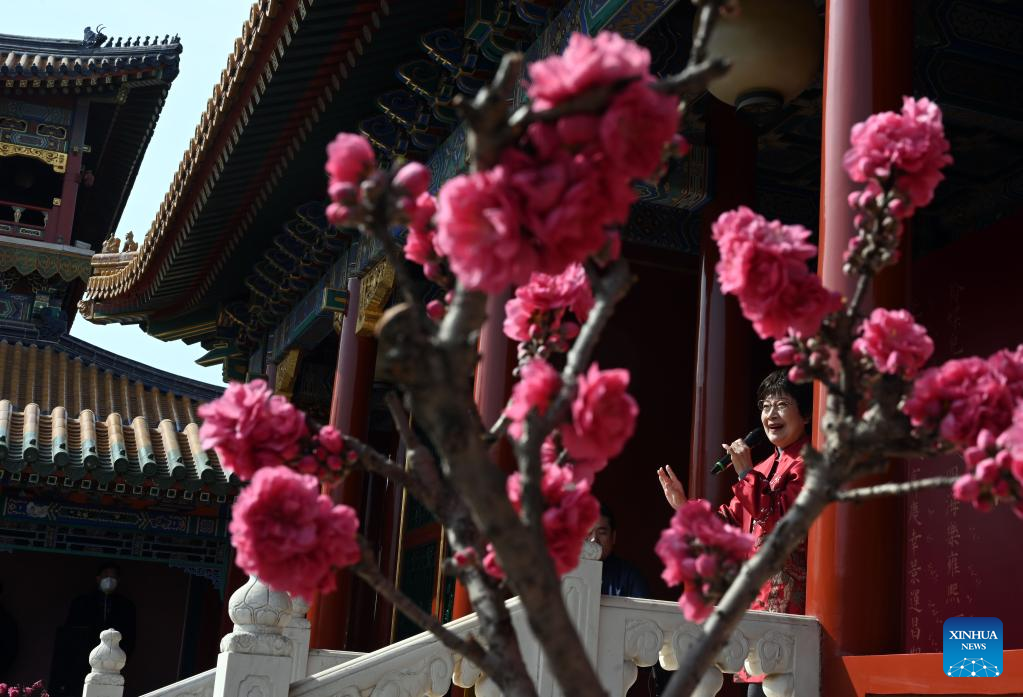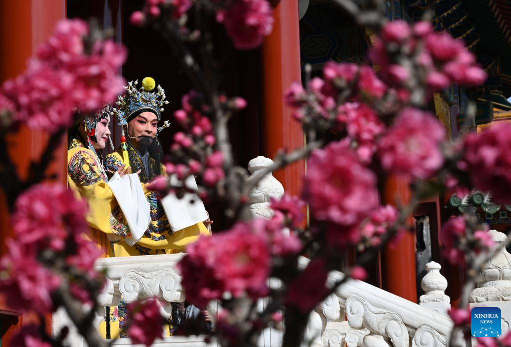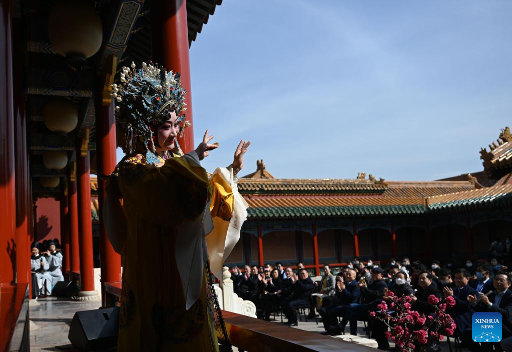 Kunqu opera performer Zhang Jingxian (R) and traditional Chinese musical instrument Guqin performer Yang Zhijian are seen during their performance of an excerpt of the Kunqu opera masterpiece The Peony Pavilion at the Palace Museum in Beijing, capital of China, March 13, 2023. The Palace Museum and Shanghai Kunqu Opera Troupe signed a strategic cooperation agreement here Tuesday to restage Chinese classic operas. (Xinhua/Jin Liangkuai)