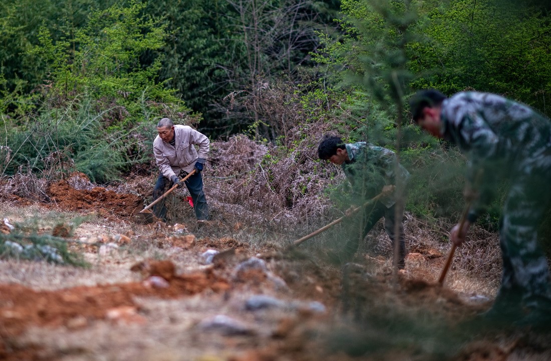 Photo taken on March 12 shows villagers from a township in Luliang county, Qujing, southwest China’s Yunnan Province, planting trees on Huamu mountain. (Xinhua/Jiang Wenyao)