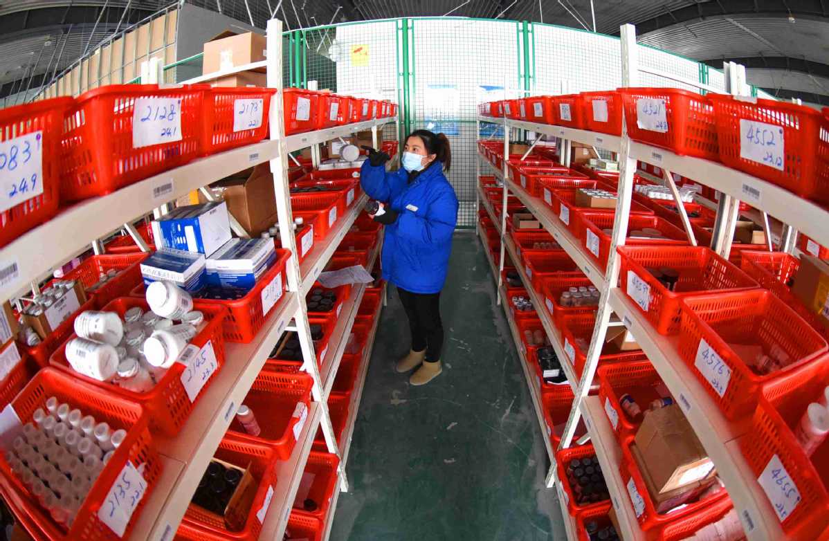 An employee arranges packages at a warehouse in a cross-border e-commerce industrial park in Lianyungang, Jiangsu province, in February. GENG YUHE/FOR CHINA DAILY