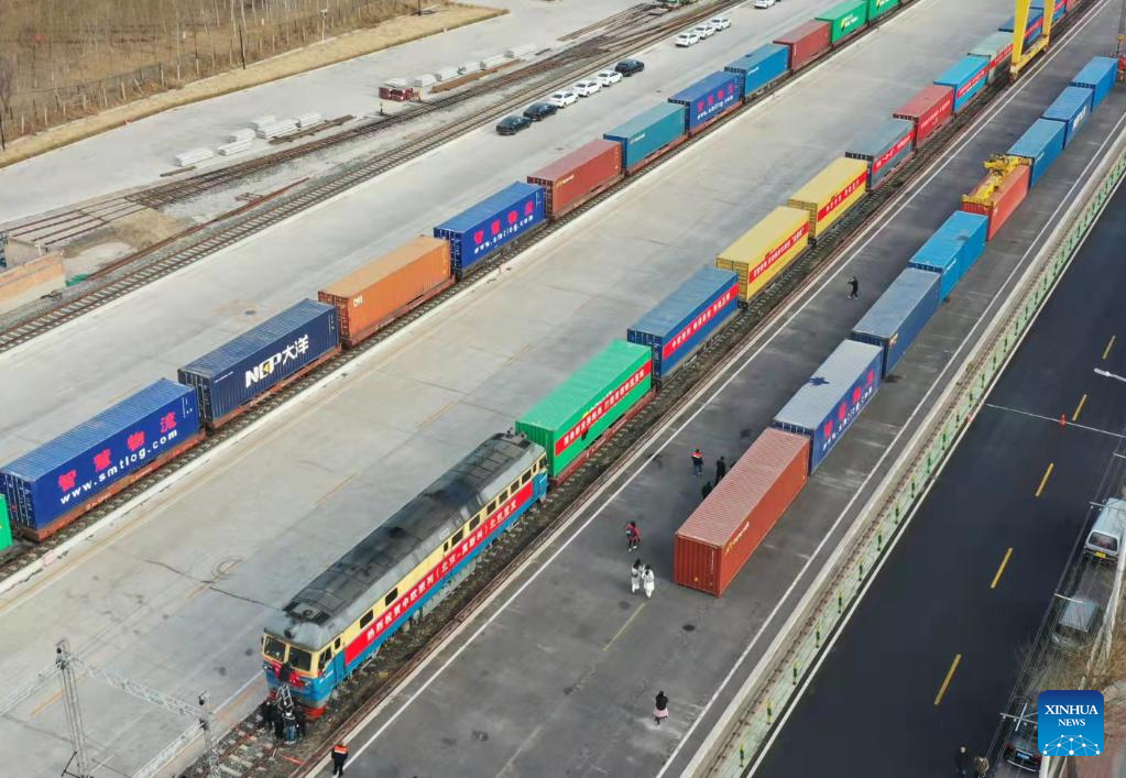 A China-Europe freight train heading for Moscow is pictured at Mafang railway station in Pinggu District of Beijing, capital of China, on March 16, 2023. A cargo train loaded with 55 containers left Beijing Thursday morning for the Russian capital Moscow, marking the launch of the first direct China-Europe freight train service from the Chinese capital.(Xinhua/Ren Chao)