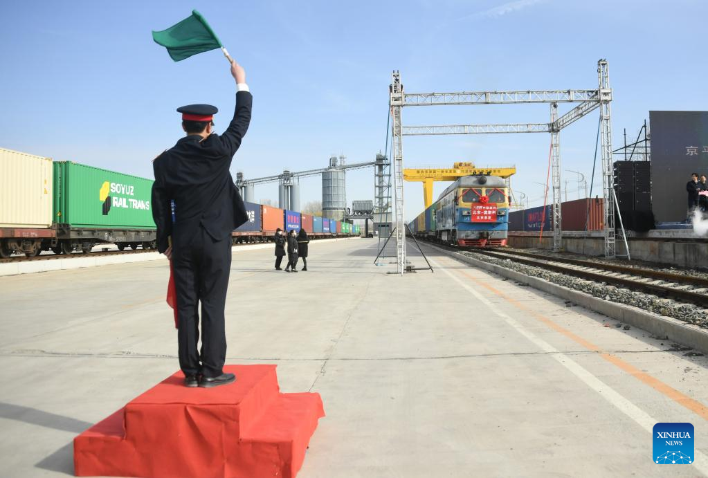 The freight train carrying goods such as construction materials, household electrical appliances and clothing departed from the logistic hub of Pinggu District in the northeast of the city and will exit the country via Manzhouli Port in north China's Inner Mongolia Autonomous Region.