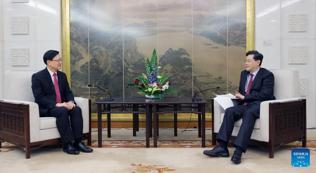 BEIJING, March 16 (Xinhua) -- State Councilor and Minister of Foreign Affairs Qin Gang on Thursday met with John Lee, chief executive of the Hong Kong Special Administrative Region (HKSAR), in Beijing to exchange their views on diplomatic work related to the HKSAR.