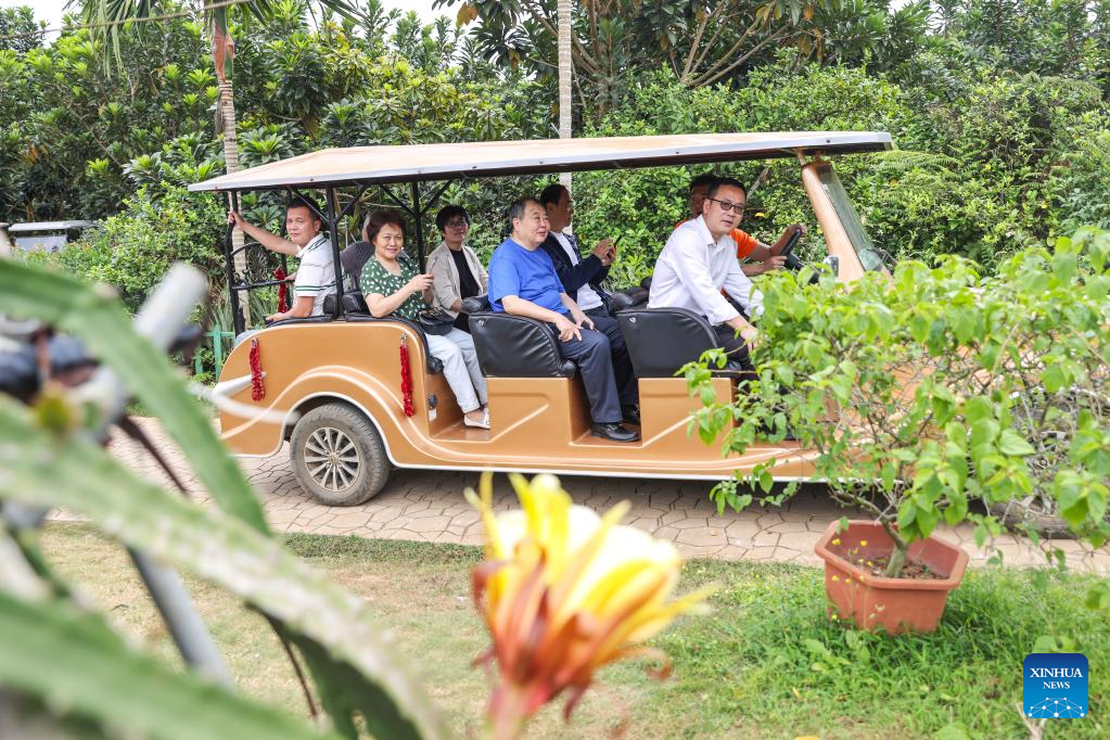 Tourists take a sightseeing vehicle at a scenic spot featuring tropical fruits in Qionghai, south China's Hainan Province, March 15, 2023. As a key project of a pilot zone for international agricultural cooperation in Hainan Province, the scenic spot has introduced more than 500 kinds of tropical fruits from all over the world, which promotes the integrated development of agriculture and tourism. (Xinhua/Zhang Liyun)