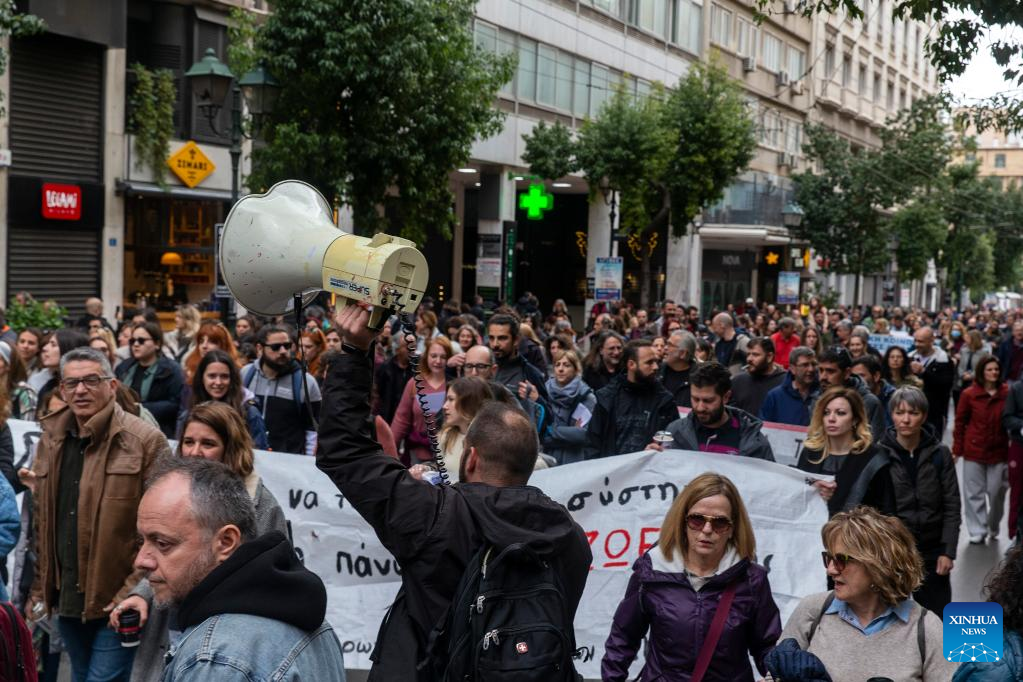 People take part in a demonstration in Athens, Greece, on March 16, 2023. Greece's public services, including transport, were paralyzed on Thursday by a 24-hour nationwide general strike called by labor unions over the deadly train accident last month. (Xinhua/Marios Lolos)