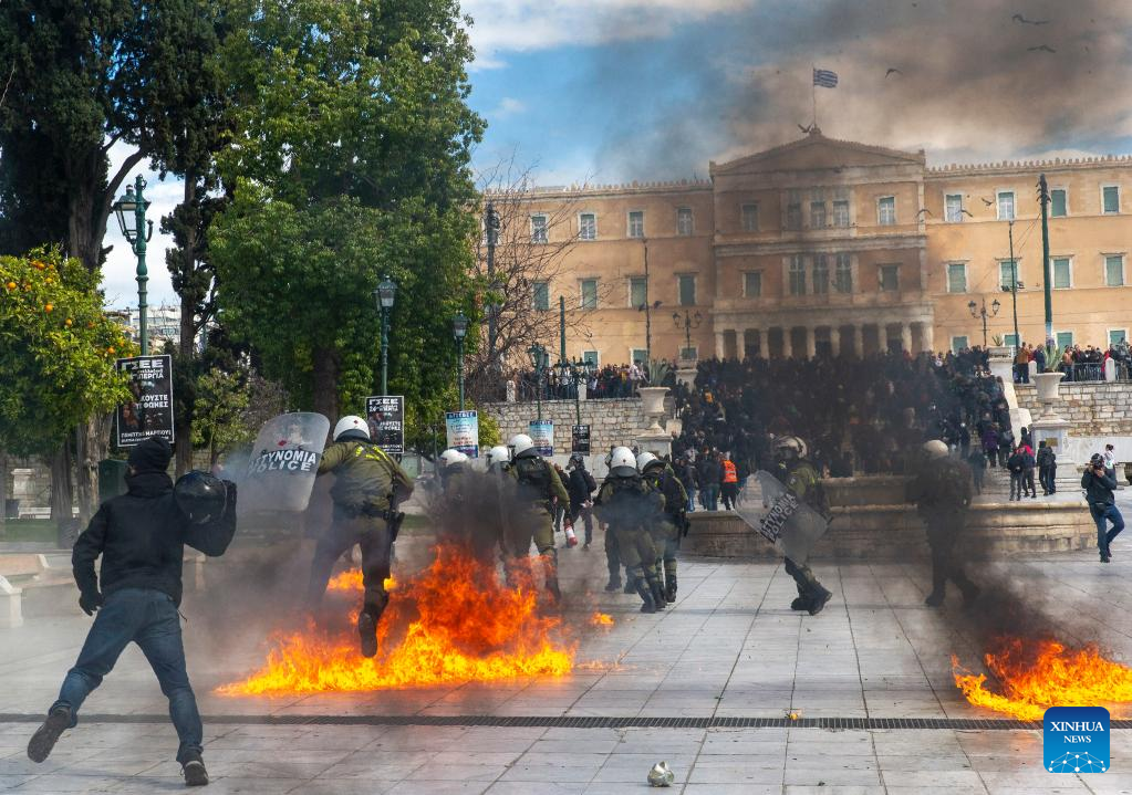 People clash with riot police during a demonstration in Athens, Greece, on March 16, 2023. Greece's public services, including transport, were paralyzed on Thursday by a 24-hour nationwide general strike called by labor unions over the deadly train accident last month. (Xinhua/Marios Lolos)