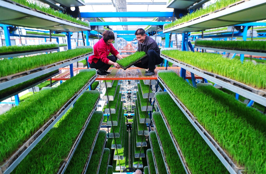 Farmers take care of ratoon rice seedlings at a full-automatic and intelligent workshop in Guangshan county, Xinyang, central China’s Henan Province. (Photo/Xie Wanbai)