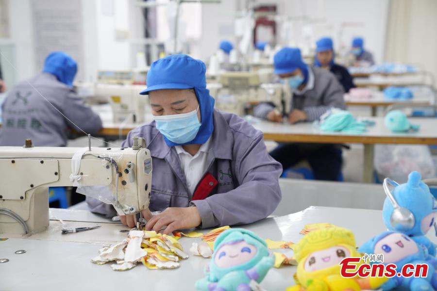 Workers sew plush toy of Hangzhou 2022 Asian Games mascot at a factory in Hangzhou, east China's Zhejiang Province, March 16, 2023. (Photo: China News Service/Qian Chenfei)