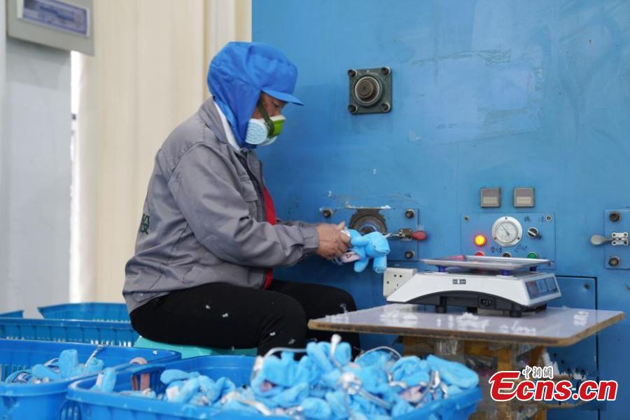 A worker fills cotton to a plush toy of Hangzhou 2022 Asian Games mascot at a factory in Hangzhou, east China's Zhejiang Province, March 16, 2023. (Photo: China News Service/Qian Chenfei)