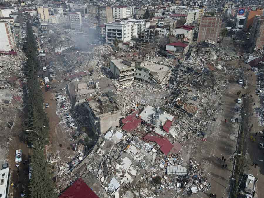 This aerial photo taken on Feb. 7, 2023 shows collapsed buildings after a powerful earthquake in Kahramanmaras, Türkiye. (Photo by Mustafa Kaya/Xinhua)