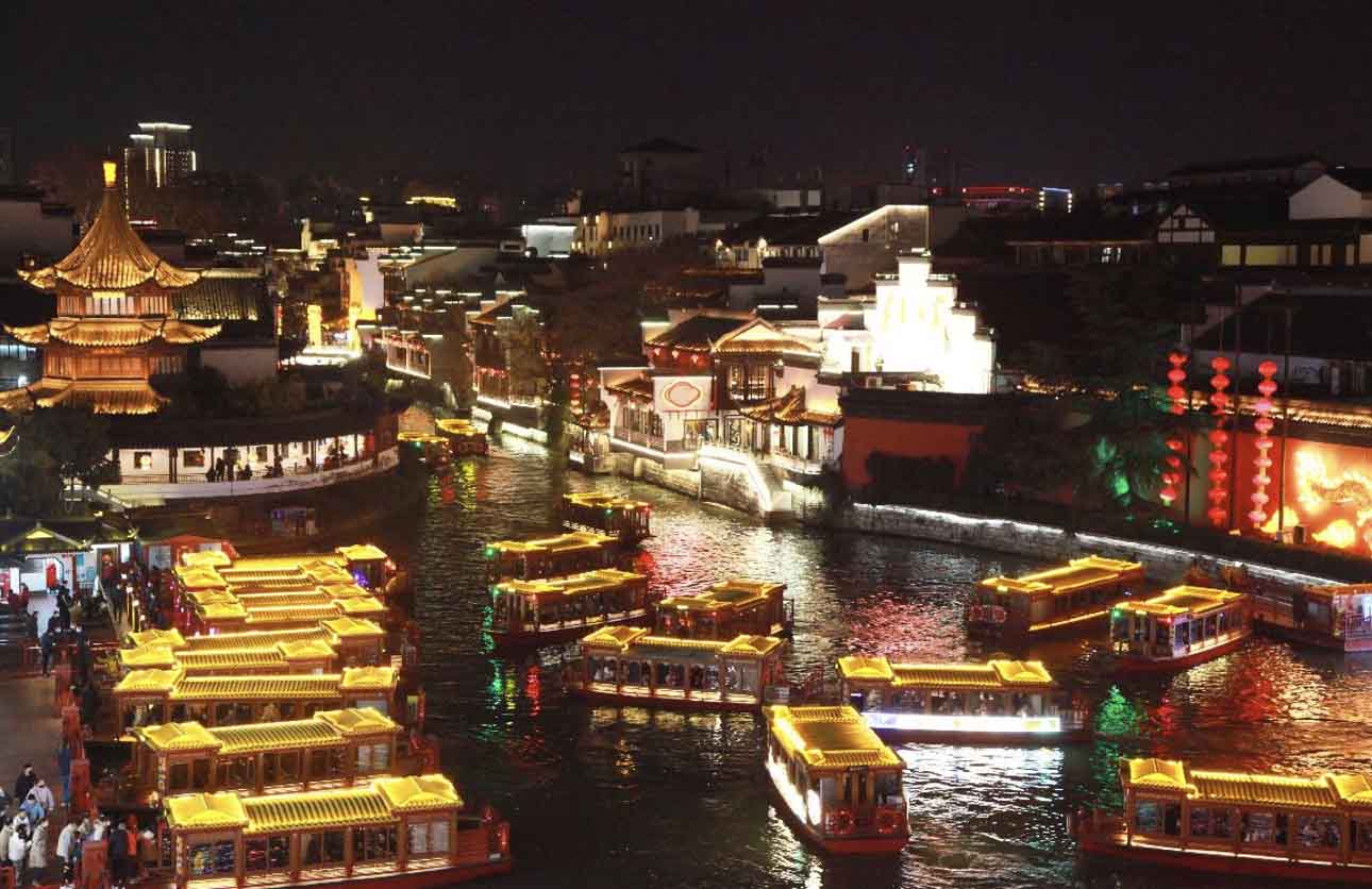 Tourists go boating on the Qinhuai River at the Confucius Temple scenic area in Nanjing, east China's Jiangsu province, Feb. 3, 2023. (Photo by Liu Jianhua/People's Daily Online)
