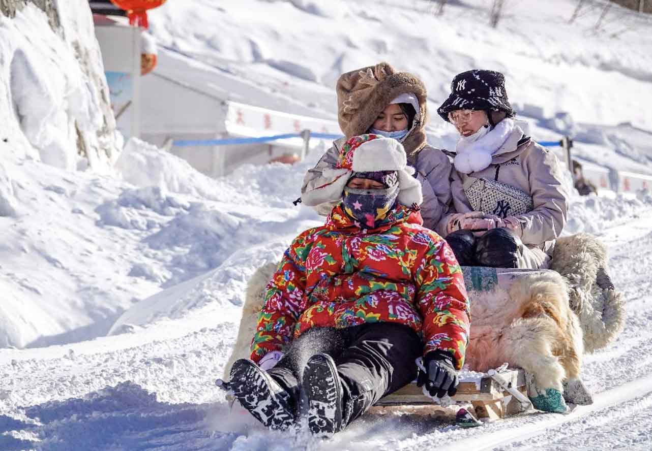 Tourists go sledding at Changbai Mountain scenic area in northeast China's Jilin province, Feb. 2, 2023. (Photo by Lv Haojun/People's Daily Online)