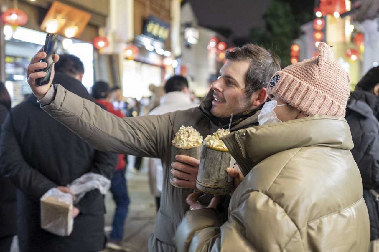 Foreign tourists pose for a picture holding tea drinks with local features in Suzhou, east China's Jiangsu province, Feb. 1, 2023. (Photo by Wang Chu/People's Daily Online)